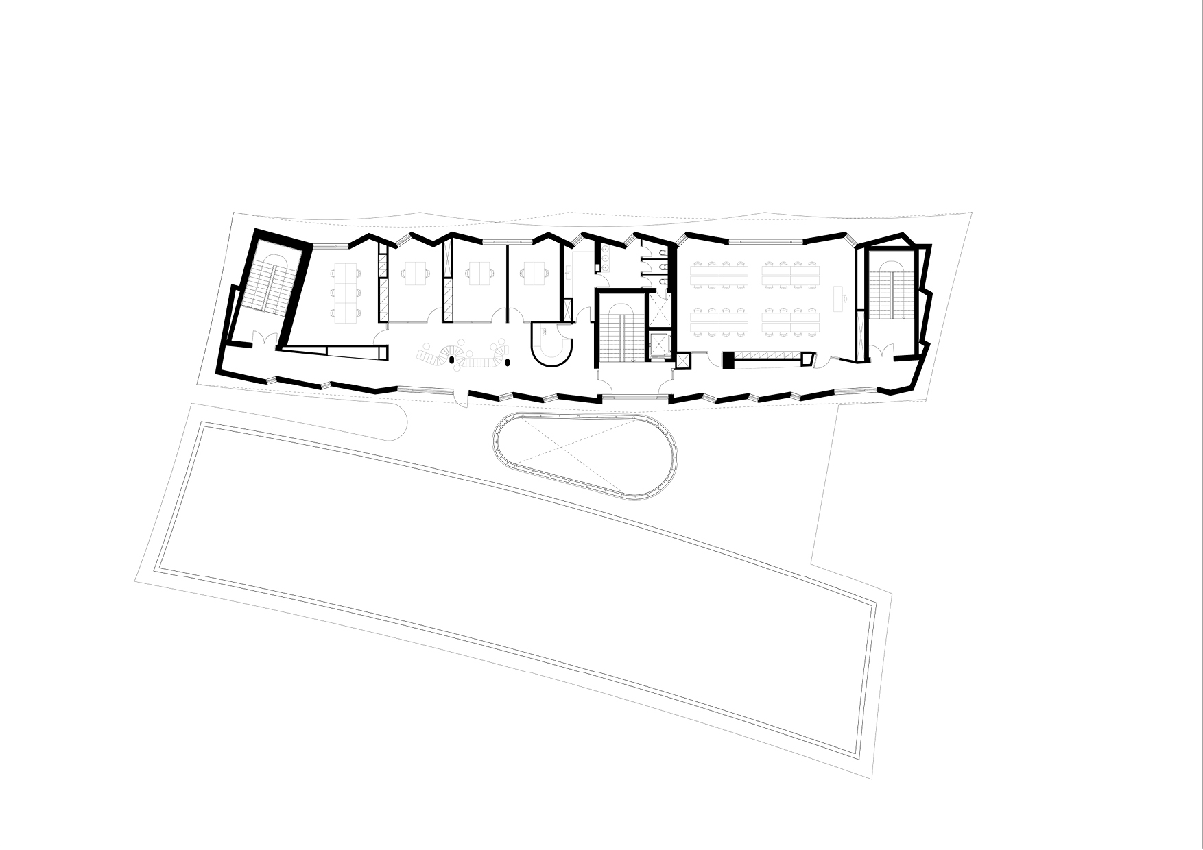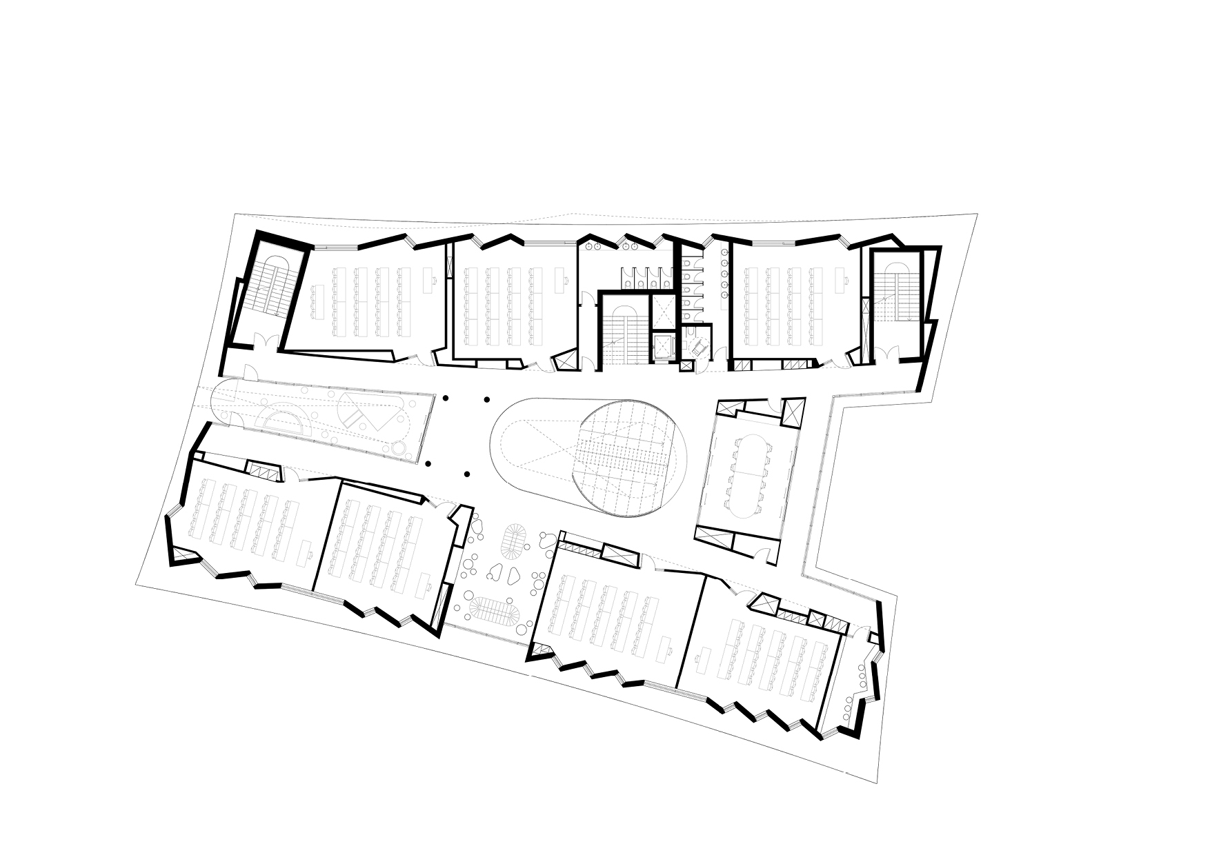 The building supports contemporary modes of learning, blending formal and informal spaces to encourage collaboration, flexibility, and connection. Adaptable classrooms, quiet study areas, media spaces, and multifunctional amphitheaters offer a diverse range of learning environments. At the heart of the interior, a sculptural staircase with integrated bleacher seating becomes a gathering point for interaction and exchange.